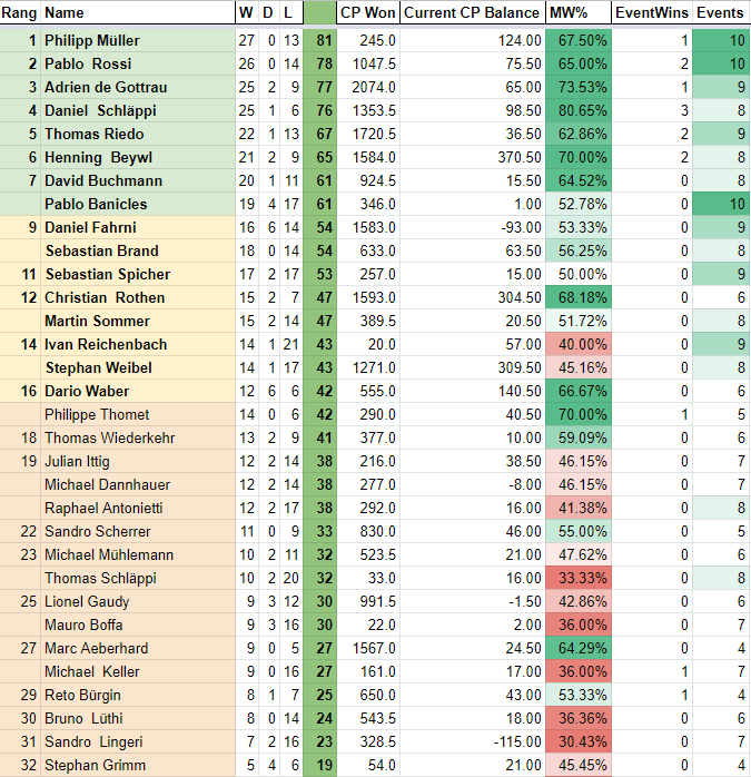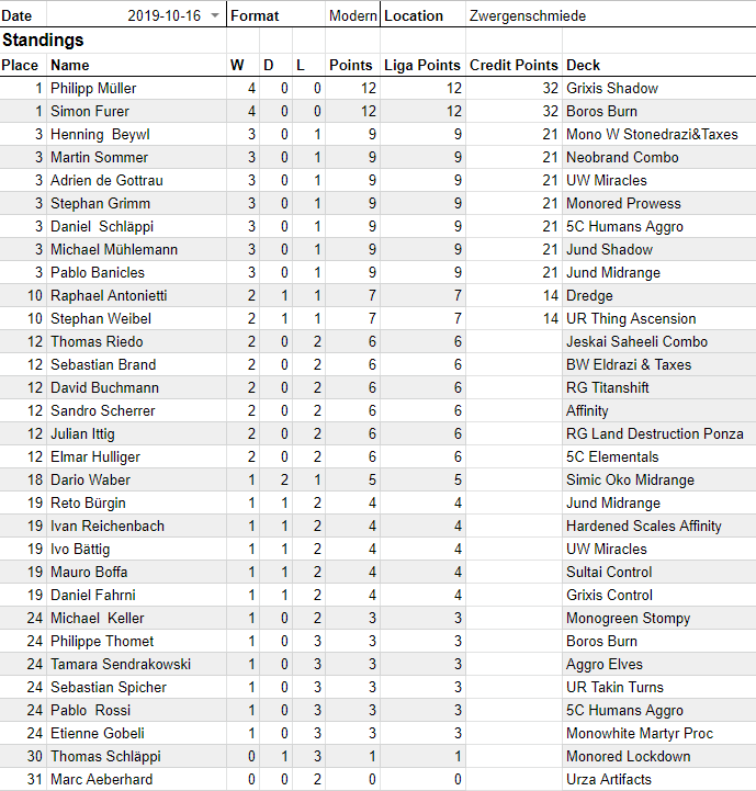 Ligaturnier 10 war vor den Swiss Magic Masters mit 31 Spielern gut besucht. Gewonnen hat unser Burn Spezialist Simon Furer aus Thun sowie Philipp Müller mit Grixis Shadow konnte 4-0 gehen. Grats!