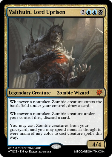 Es ist ein Zombie. Ich habe ihn mal bei einer Google Aktion gefunden. Es war liebe auf den ersten Blick. Auf den zweiten Blick erkannte ich dann, dass er eine Custom Card ist. Ab und an Spiele ich ihn, wenn liebe Freunde mir erlauben Ihn als Commander zu nutzen. Sein Name ist «Valthuin, Lord Uprisen» und seinem Erschaffer zu ehren (den ich wahrscheinlich nie kennenlernen werde) belasse ich ihn weitestgehend so wie er ist. Auch sein Artwork finde ich äusserst passend. Vielleicht verpasse ich ihm mal ein eigenes Artwork, wenn ich Lust dazu habe. Aber dann würde ich darauf achten, dass er nichts von seiner machtvollen Haltung und dem erhabenen Blick verliert.