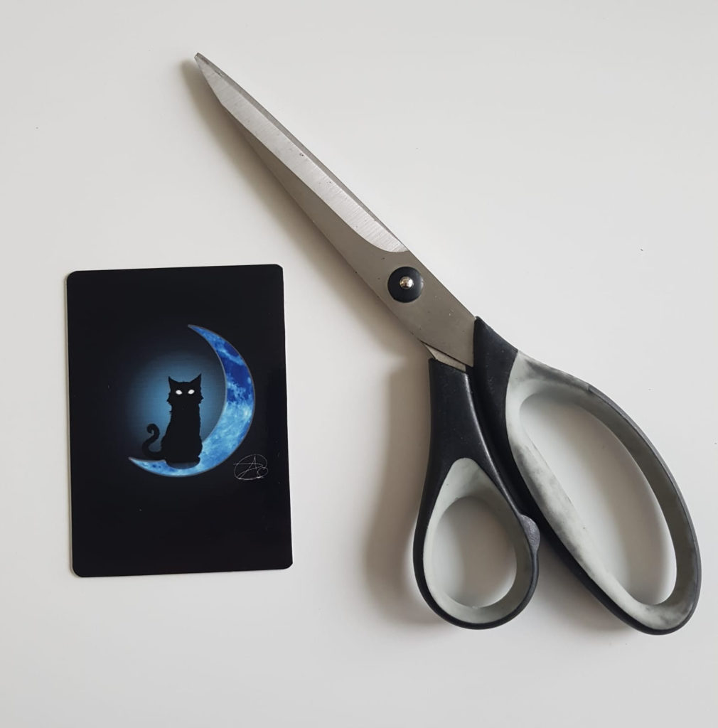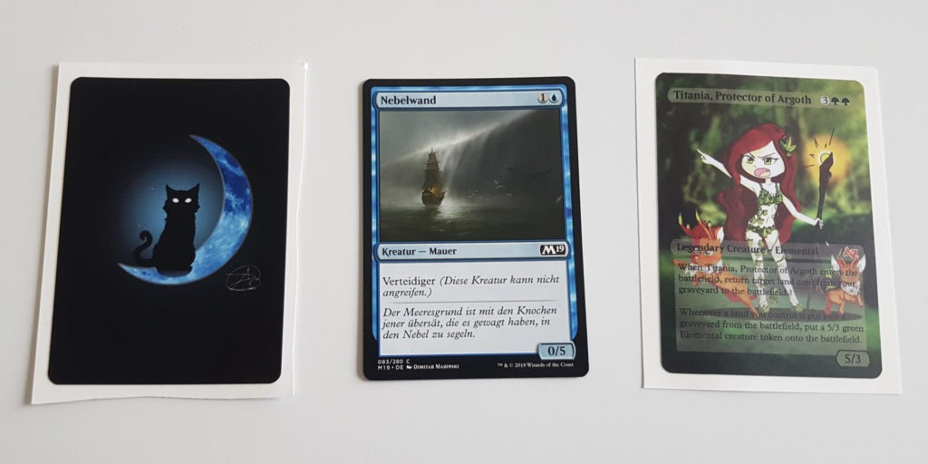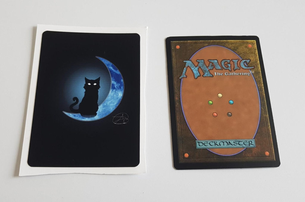 Zum Kleben verwende ich eine normale Common Magic Karte. Auf der Rückseite klebe ich mein Logo, welches mit einer Glanzfolie beschichtet ist. Und es ist eine Katze also… zumindest ich gebe hier 100 Niedlichkeitspunkte.